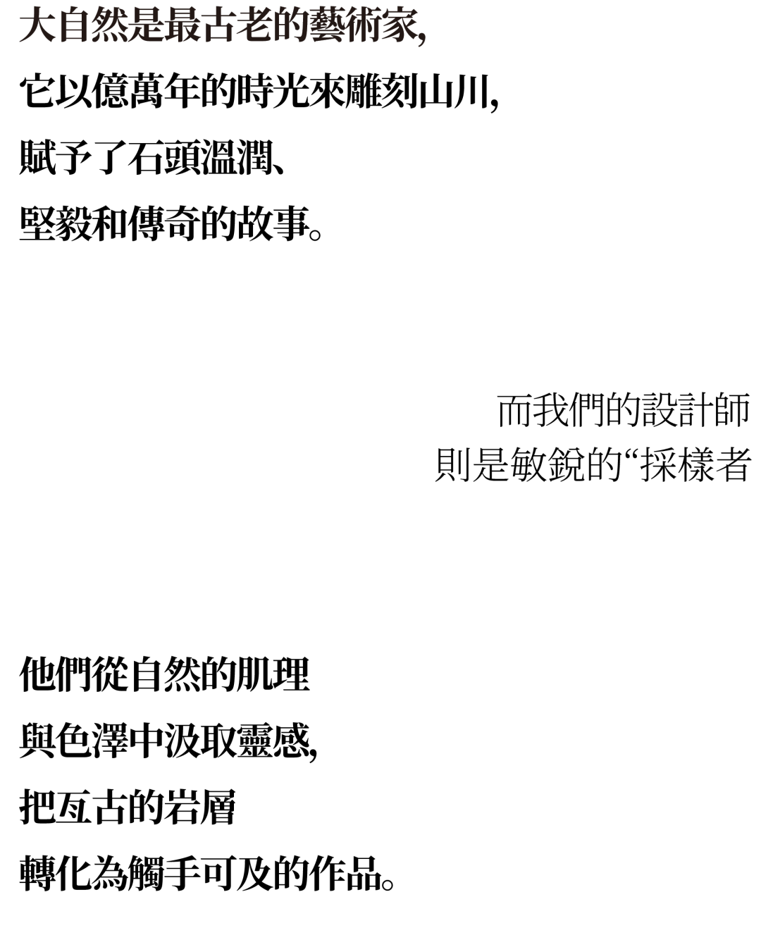Nature is like an artist carving mountains and rivers over billions of years, and giving stones with warmth, resilience, and legendary tales. While designers are keen “samplers”, drawing inspiration from textures and hues which can be found in the nature, thereby transforming raw rocks into tangible creations.