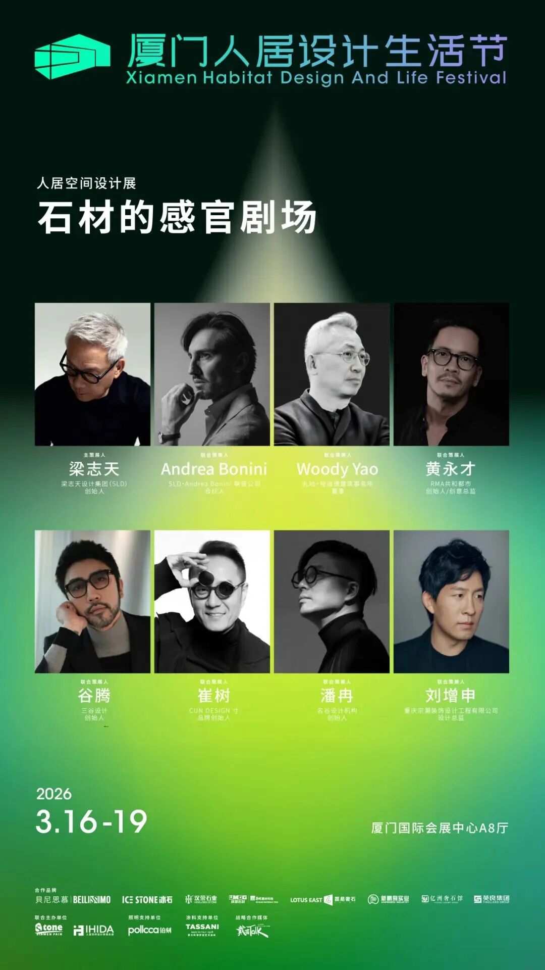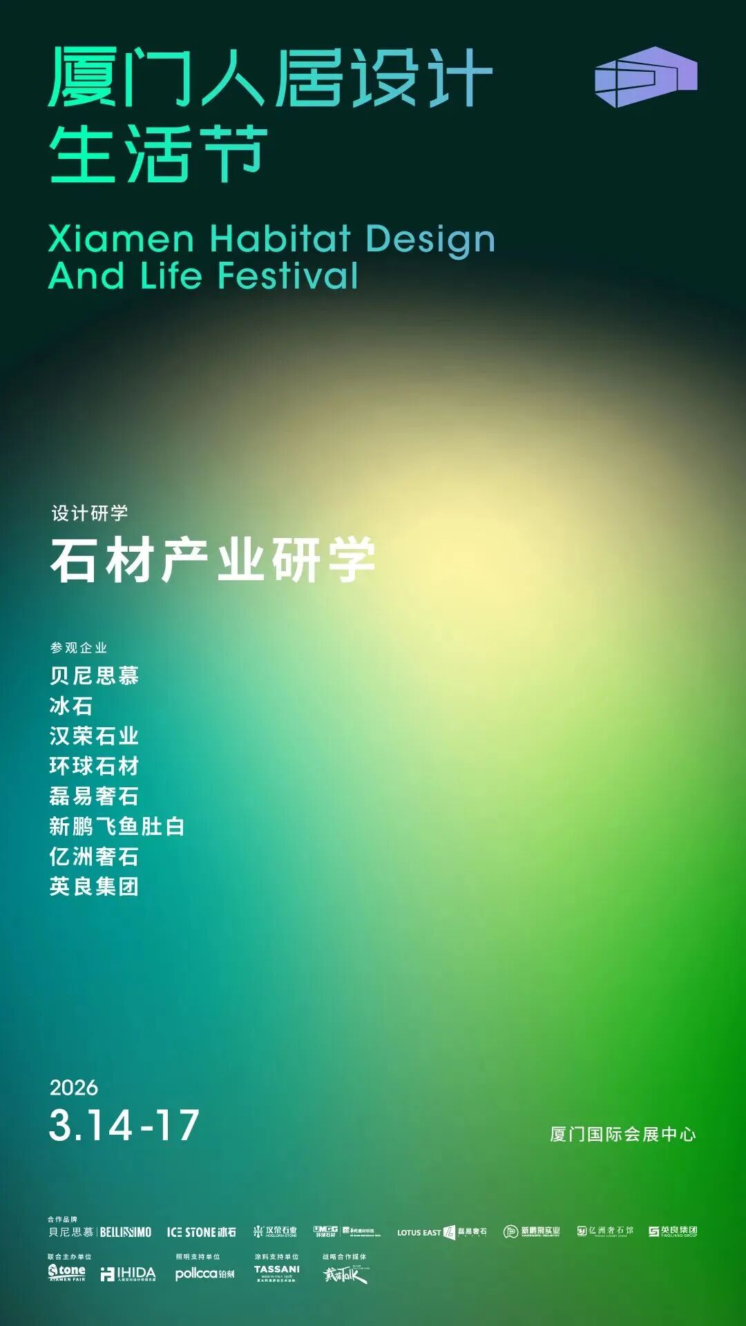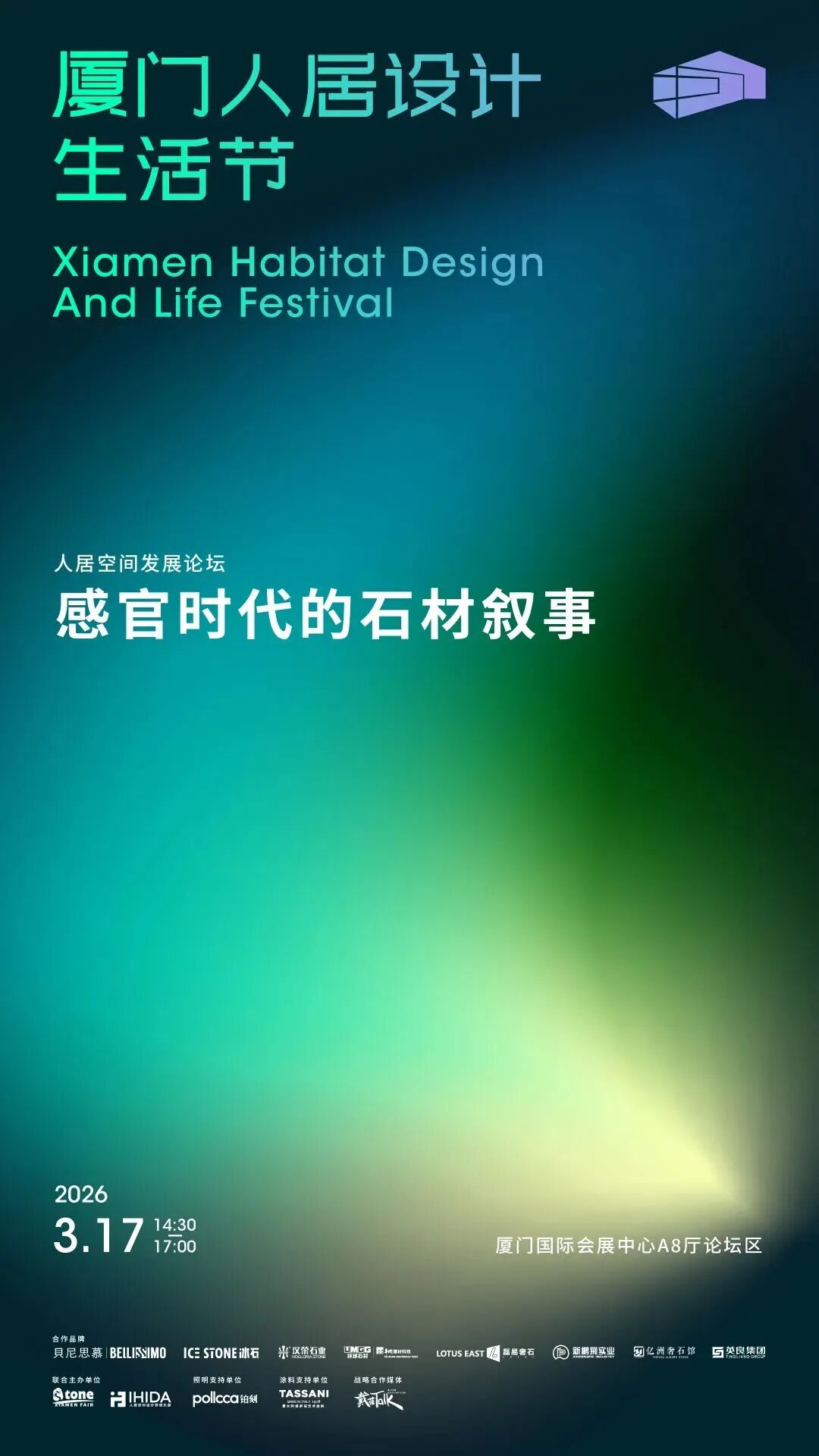2026年厦门人居设计生活节,以"石材的感官剧场"为主题,展览、论坛与产业研学三位一体,以前瞻性视野汇聚全球设计思维,系统激发石材的潜能,推动石材与当代人居空间的深层融合。